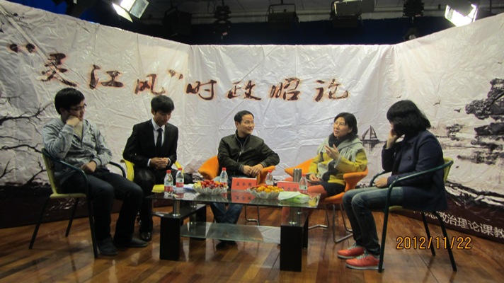 11月22日晚,由思政部举办的第三期“灵江风”时政昭论在新闻演播厅火热开评。晁乐红博士、孟令国老师应邀担任教师嘉宾,10历史张秀秀、练振两位同学作为员工代表参加讨论。