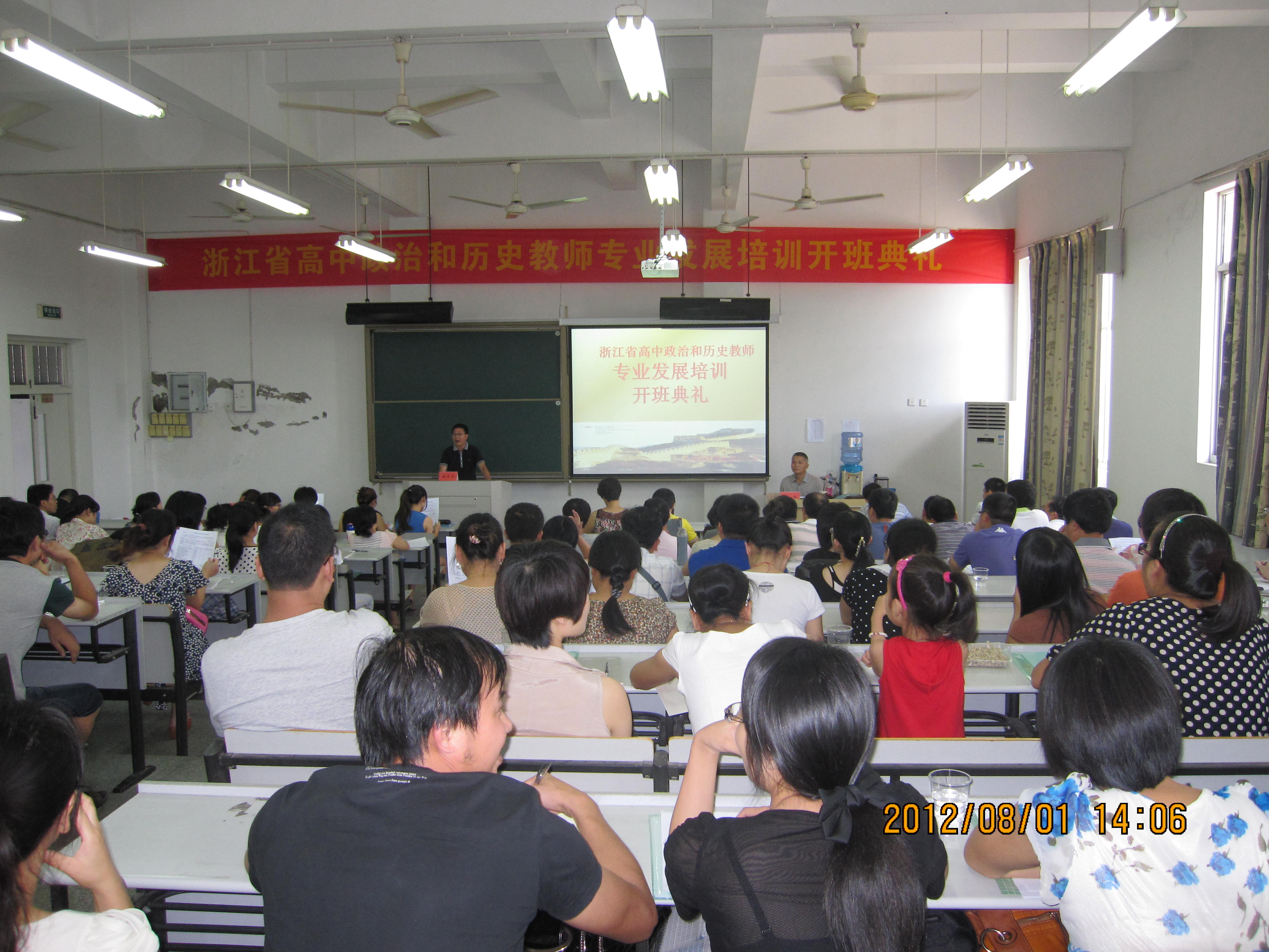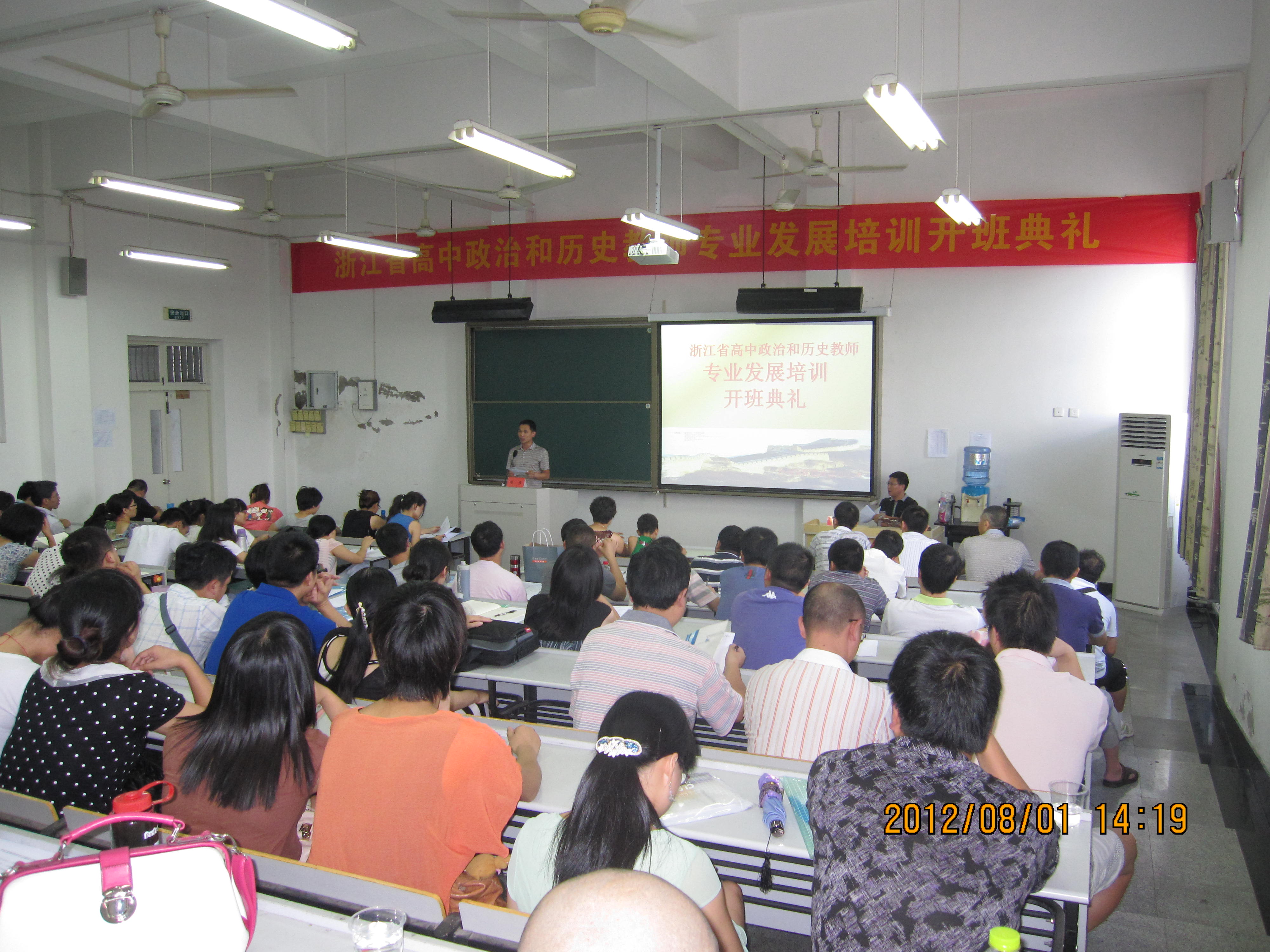 8月1日下午,浙江省高中政治、历史教师专业发展培训开班典礼在公司临海校区举行。思政部党总支书记杜才平致辞,思政部副主任林伟主持,来自台州各县市区及杭州、宁波、温州、金华、衢州和舟山等地的124名学员参加开班典礼。
