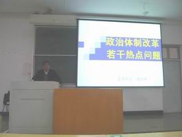 “我国政治体制改革路在何方?”,讲座伊始,浦兴祖教授就以开放严谨的风格切入主题,请同学们发言提问。同学们积极响应,纷纷提出了我国政治体制改革的相关认识和思考,浦教授一一作了解答,有重点、深层次、多角度地剖析了中国政治体制改革亟待解决的问题,提出了政改的关键是——如何处理权力集中与民主发展的问题。他指出,在基层民主建设的过程中,普遍存在着权力过分集中,监督失衡、民主受阻的现象。基层选举要强化民主意识、民主实践,在全民自治能力和水平参差不一的情况下,不能忽视党和政府的领导执行力。浦教授向同学们详细介绍了中国政改的坎坷之路:从上世纪50年代的政改起步——60、70年代“十年文革”——80年代《党和国家领导制度的改革》的政改指导性文件的制定——“89风波”、东欧剧变、苏联解体,防止西方“和平演变”,我国政治体制改革走过了一段极不平常的历史时期,政治体制改革一直在积极稳妥推进,探索政改“突破口”。最后,浦教授就中国政治体制改革提出了四个“要相信不要迷信”作为讲座结束语:一是,对于人民的选择要相信不要迷信;二是,对于宪法的权威要相信不要迷信;三是,对于枪杆子的威力要相信不要迷信;四是,对于经济发展成果要相信不要迷信。