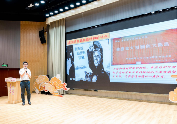 全场全程围绕大陈岛垦荒精神为主题,开展了“九个一”活动:一是看一场电影,播放由大陈供电所党支部书记、垦二代王海强的先进事迹改编的主题微电影《传承》;二是颁一份证书,聘请王海强书记为“德育导师”;三是讲一堂微课:由王海强“老师”为员工们带来受聘后的第一课;四是作一次解读:由盛跃明副经理对大陈岛垦荒精神进行现场解析;五是唱一首红歌:由公司员工演绎反映垦荒队员生活的歌曲《那时我们正年轻》;六是做一次访谈:由林伟经理对大陈供电所的三代电力垦荒人进行访谈;七是献一首诗歌:由国网青年员工诗朗诵,献礼新中国成立70周年;八是亮一面旗帜:由椒江公司领导为国网浙江红船(椒江大陈)共产党员服务队授旗;九是温一次誓言:由现场的全体党员重温入党誓言。最后,活动在全场合唱《歌唱祖国》的歌声中落下帷幕。