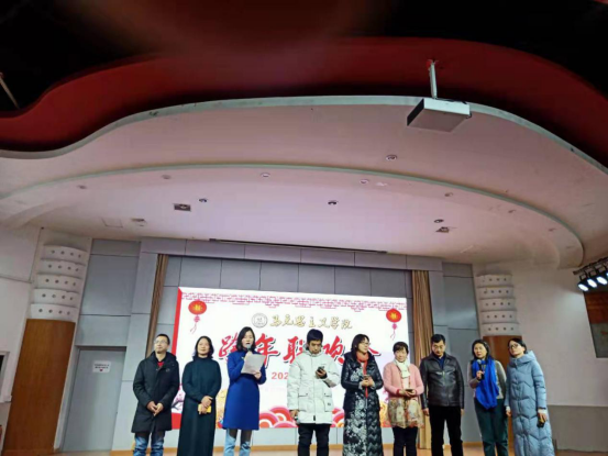 联欢会在林伟经理领唱的合唱歌曲《社会主义好》中热烈开场,全场歌声嘹亮,激昂澎湃,迅速营造了浓烈的节日氛围。在座的每位老师都准备了精彩的表演,穿着红军服装的马克思主义中国化教学与研究团队为大家演唱了《红军不怕远征难》、《我为祖国献石油》,表达了强烈的爱国之情以及革命情怀;思想道德修养与法律基础教学与研究团队为大家表演了毛泽东诗词朗诵,带我们再次领略了毛泽东主席的豪迈情怀;中国近代史纲要教学与研究团队为大家表演了儿歌串烧,让我们回忆起了儿时的童真与美好;马克思主义基本原理教学与研究团队在抗疫的背景下为大家带来了手语舞蹈《感恩的心》,表达了对抗疫人员由衷的感谢与祝福;由办公室团队带来的健身操《小苹果》将联欢会的氛围推向了高潮,大家穿着红衣服整齐划一地舞蹈,营造了喜庆活泼的气氛,调动了在场所有人的热情。此外,老师们的个人表演亦是精彩绝伦,俞应祥老师独唱了一首《涛声依旧》,祝愿大家能够健康依旧,年轻依旧,开心依旧;侯水仙老师的越剧选段《进书房》让我们见识了老师的多才多艺;崔永江老师的诗朗诵《再别康桥》和杨供法老师独唱的《冬恋》让我们感受到了上个世纪美好纯真的情感……除了内容丰盛的节目表演,中间还穿插了激动人心的游戏和抽奖环节,老师们的表现引得全场爆笑连连,高潮迭起。