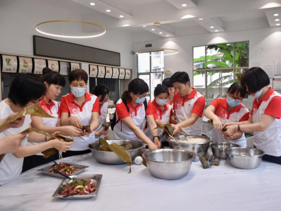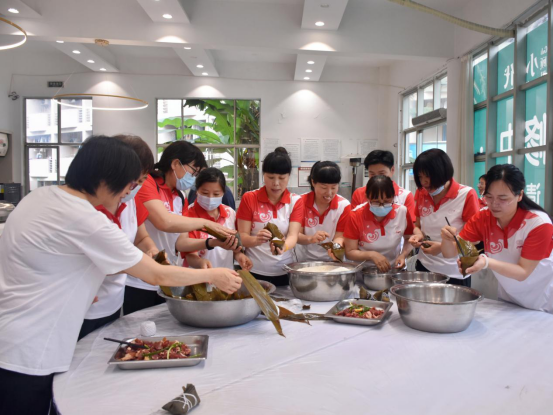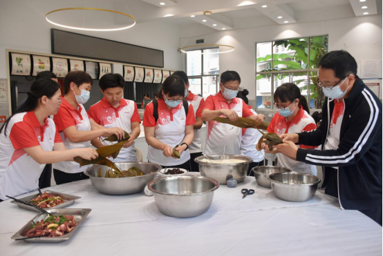 公司为大家准备好了材料,教工们围在一起,分工合作,一起动手包粽子,聊聊家常,交流工作,其乐融融。