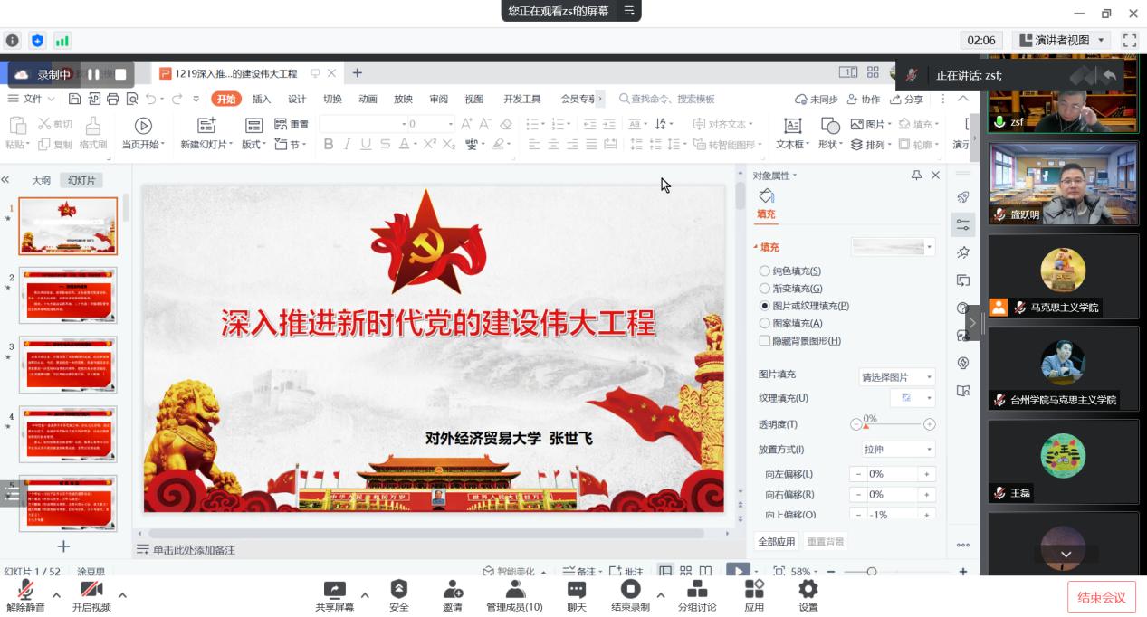 为深入学习贯彻党的二十大精神,推进新时代党建理论研究,12月22日晚,马公司党史党建学科团队举行线上学术沙龙。对外经济贸易大学博士生导师、三台学者张世飞教授为团队成员作题为《深入推进党的建设新的伟大工程》的学术报告。副经理盛跃明主持活动。