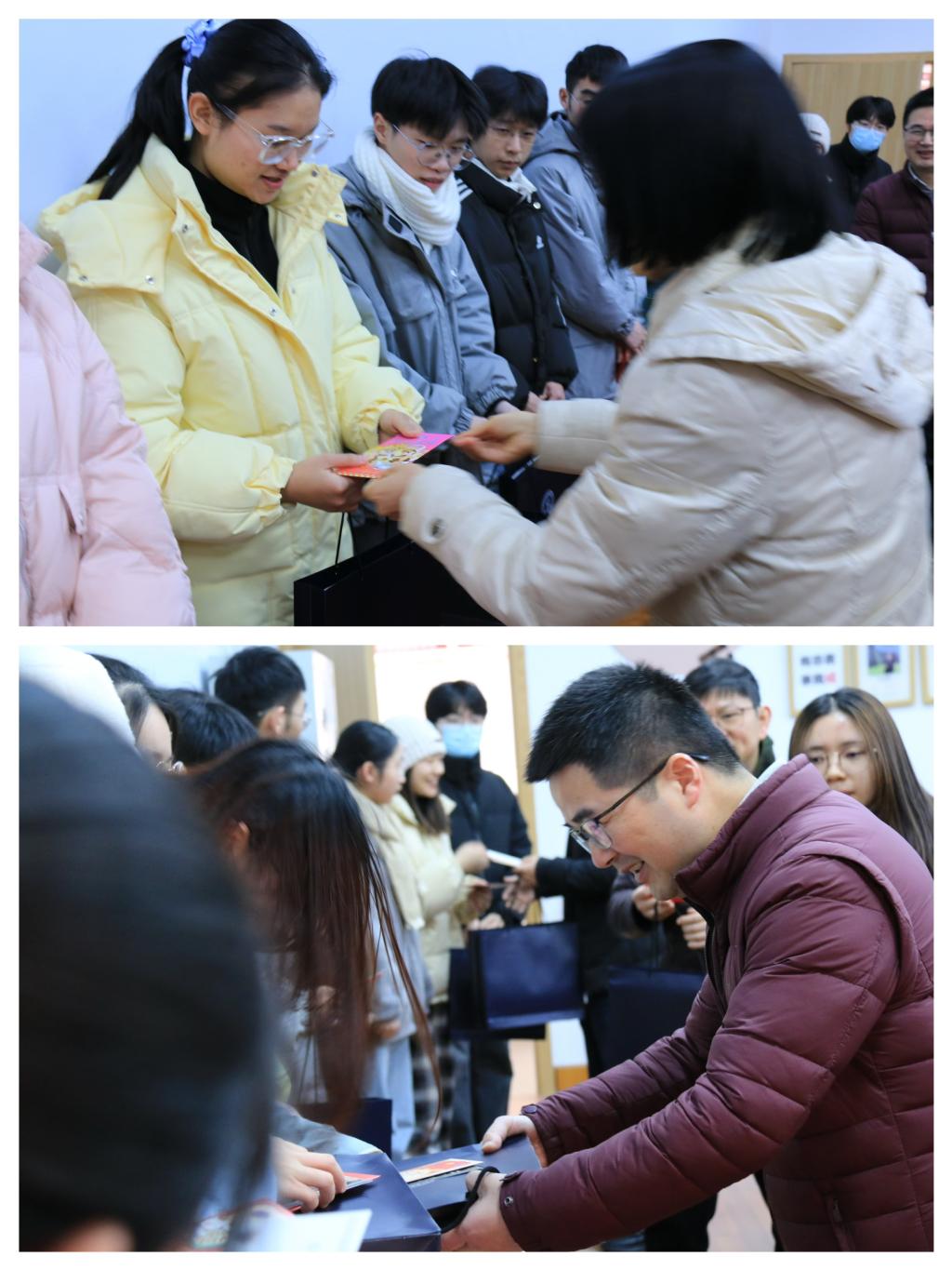 会后,全体班子成员,办公室老师一起为大家送上了考研大礼包,并在明信片上亲自撰写祝福,预祝他们能够成功上岸,早日考取自己的理想公司。