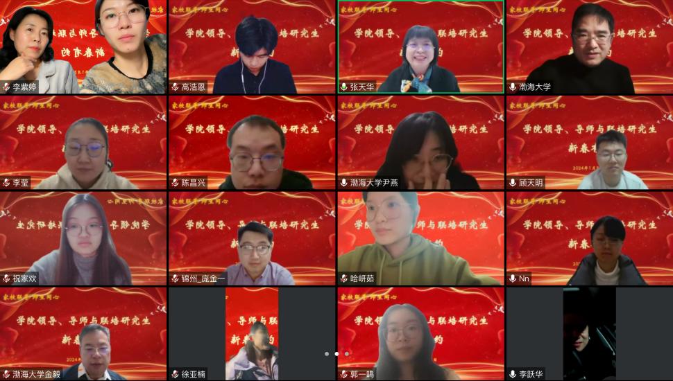 1月31日晚,马公司为联培研究生召开“新春有约”线上会议,特邀渤海大学马克思主义经理经理金毅、副经理尹燕、郭小虎及研究生家长代表参会,经理张天华、副经理李跃华、党总支副书记徐培林、研究生导师代表陈昌兴出席家校联手、师生同心“新春有约”主题会议,12名联培研究生参会,会议由硕士研究生导师张天华教授主持。