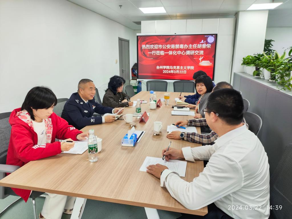 3月22日上午,台州市公安局禁毒办副主任胡普荣一行三人来到一体化研究中心调研交流禁毒教育工作,一体化研究中心首席专家、经理张天华教授、台州市大中小学思政课一体化研究中心副主任张礼强以及一体化研究中心成员王在亮博士、李正军博士参加交流。