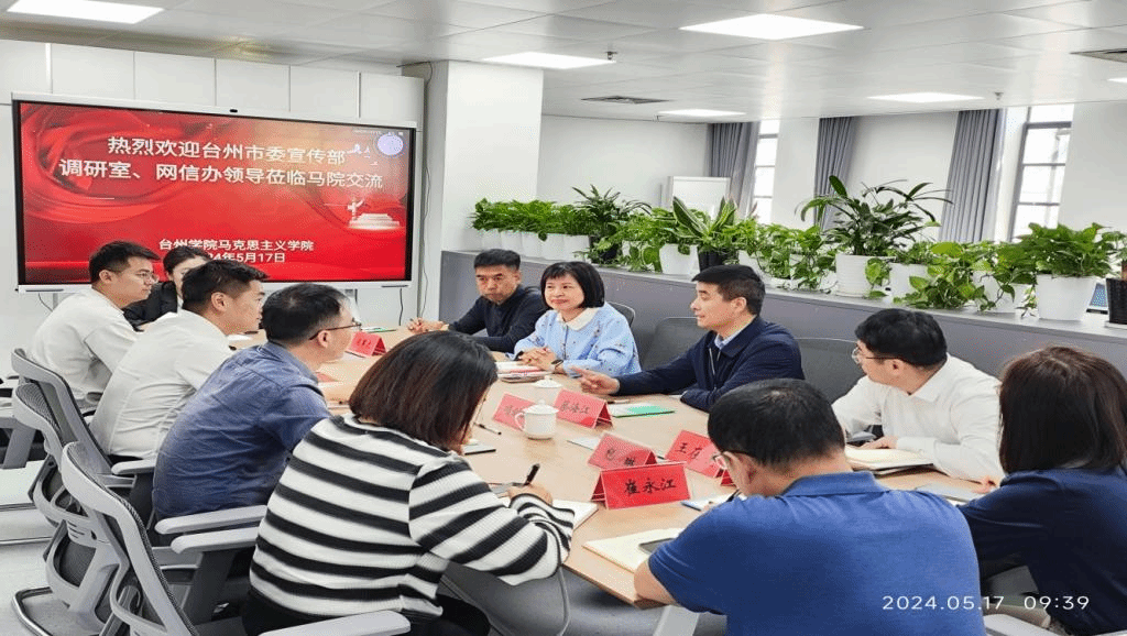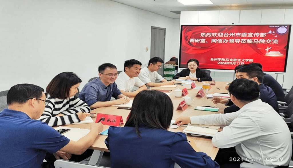 5月17日上午,台州市委宣传部调研室主任陈峰,市委网信办网络舆情导控中心主任项剑斌、副主任项益串等一行四人来校调研交流大中小学思想政治教育一体化建设工作。公司党委委员、宣传部部长蔡海江陪同调研,一体化研究中心首席专家、304永利集团经理张天华教授及一体化研究中心部分成员参加交流。