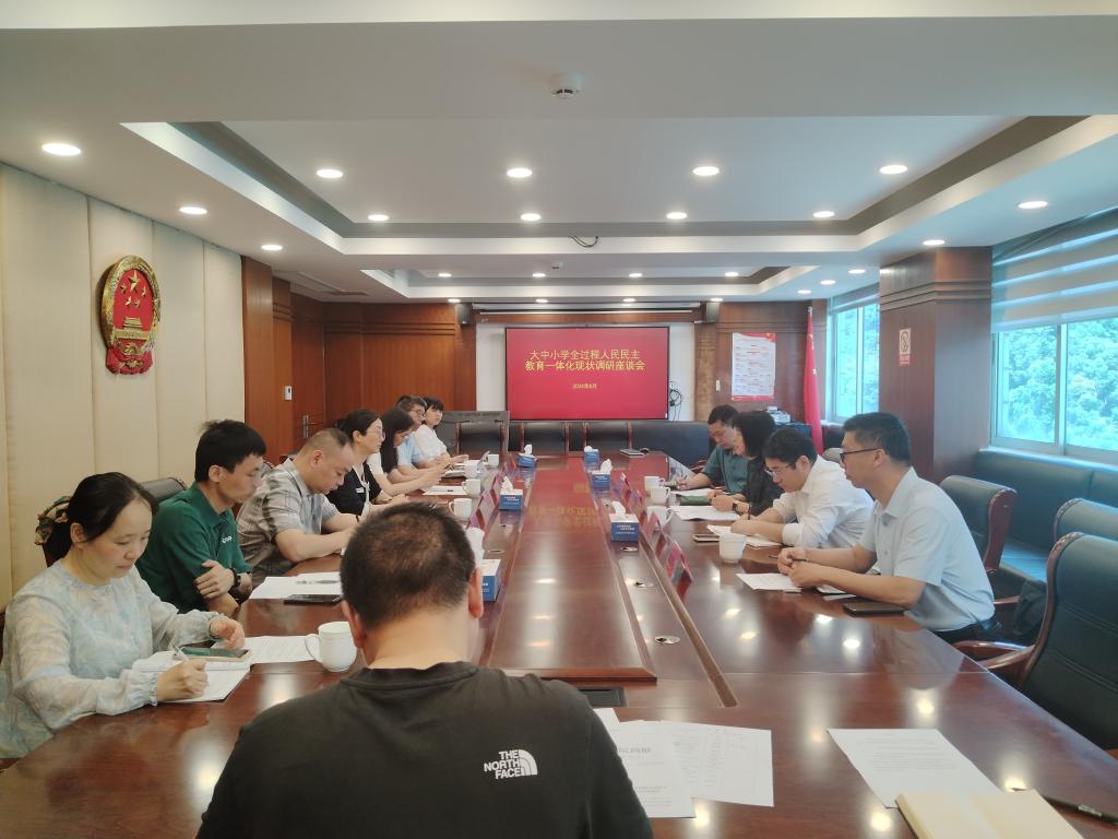 6月13日上午,台州市大中小学思政课一体化研究中心首席专家张天华教授率队到临海市人大调研大中小学全过程人民民主教育。调研会由临海市人大副秘书长张斌主持。临海市人大教科文卫工委、临海市教育局、大田街道人大工委以及临海五中、回浦中学、台州初级中学、哲商小学等部门领导、中小学董事长和思政课教师参加了调研会。一体化研究中心部分成员参加会议。