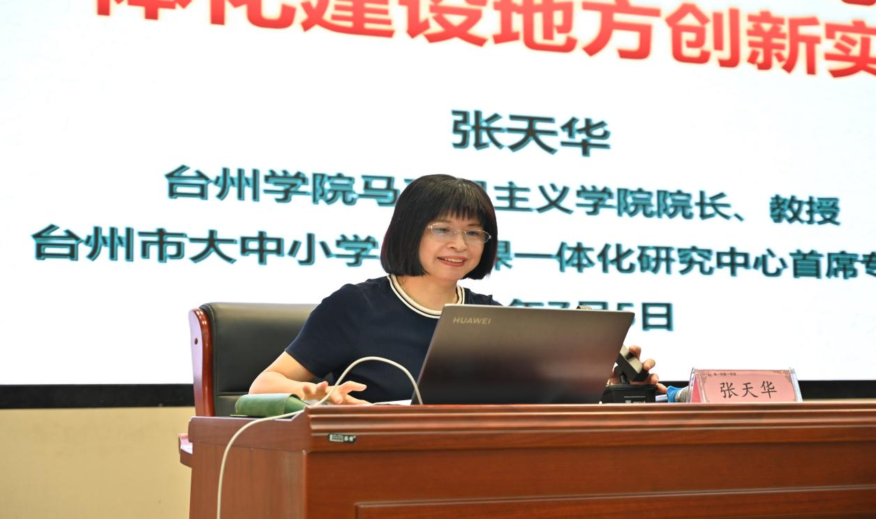 与会人员听取了张天华教授《推进跨省市大中小学思政教育一体化建设地方创新实践》专家报告。张教授从守正创新、制度建设、教学评价和台州实践四个方面突出跨省跨市大中小学浙疆思政课和思政教育一体化建设,尤其是针对阿拉尔地方特色红色资源,构建课堂、公司和地方三位一体的特色思政教育,让各公司思政教师了解了大中小学思政课一体化的重要育人功能及具体实施路径。专家报告结束后,与会大中小学董事长、阿拉尔市中小学思政名师工作室领衔人、思政学科基地领衔人进行了现场研讨,针对深入推进大中小学思政课一体化建设地方创新实践过程中的典型做法、存在问题及意见建议进行了热烈的讨论。