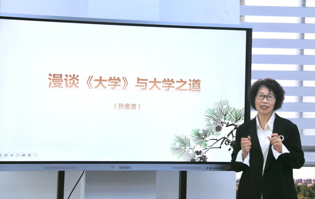 孙金波以习近平用典研究引入,从《大学》作者、译本、“大学”题解、《大学》争讼聚焦、框架主旨等方面展开讲述。首先,孙金波重点讲解了朱熹的大学章句序,分析了《大学》从唐代起逐渐进入研究者视野的过程。其次阐述了制度、学制、“大学之道”、以大人为理想等“大学”题解。然后,孙金波以台院“澡身浴德,修业及时”的校训为例,论证传统经典带给人的力量,并由此提及“明明德”“亲民还是新民”“格物致知”等《大学》中争讼聚焦的点。随后,孙金波具体论述了《大学》“三纲八目”的框架,以性善论、修身为本的政治哲学、从家到国等为代表的主旨。最后,孙金波对《大学》一书进行了总结,该书主旨宏阔,气象远大,其主导精神对于今天的青年人读书立志、责任担当、家国情怀的培养等具有启发意义,值得大家认真阅读。