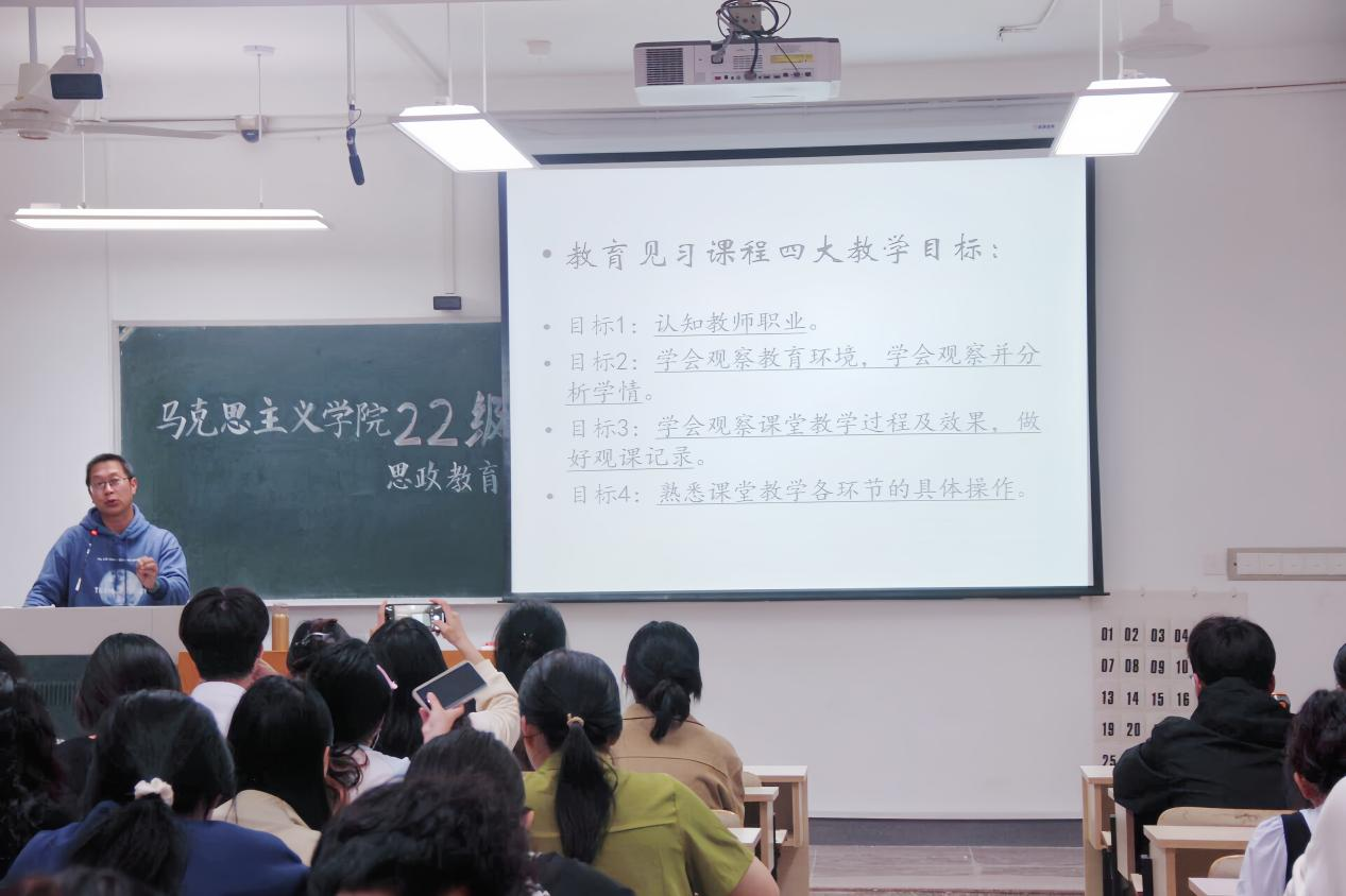 会议最后,包兆昌对见习活动进行了全面部署,讲解了见习课程四大教学目标,以及展示与中学教学相结合的教育见习日程安排表。