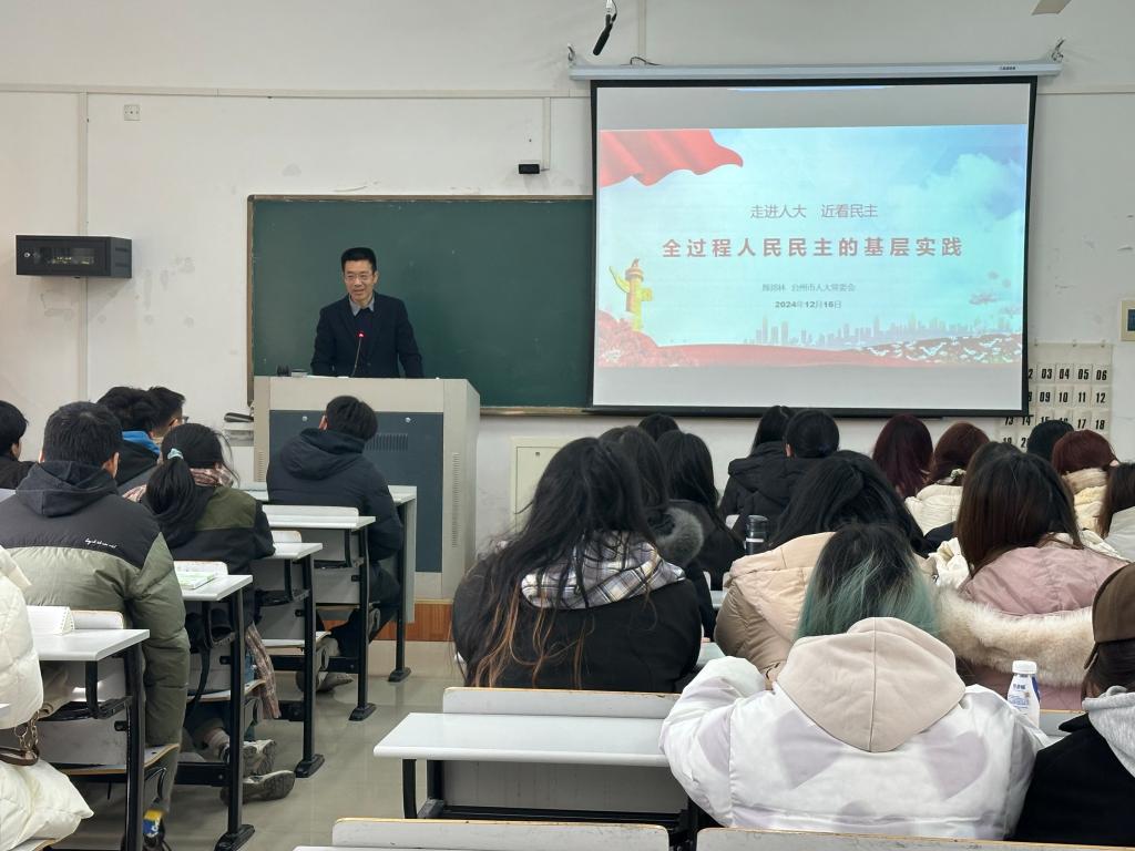 今年是全国人民代表大会制度建立70周年,颜邦林结合70年来全国人民代表大会工作取得的历史性成就,在讲述马克思主义经典作家关于社会主义民主的重要思想基础上,重点引导员工们学习了习近平总书记关于全过程人民民主的重要论述,详细讲述了台州市人大践行全过程人民民主的典型实践,使同学们对全过程人民民主有更为直观的认知、更加深刻的理解。课程最后,颜邦林鼓励同学们做全过程人民民主的积极宣传者、参与者,欢迎同学们利用课余时间深入台州市人大代表联络站,“零距离”感受人民代表大会制度魅力。