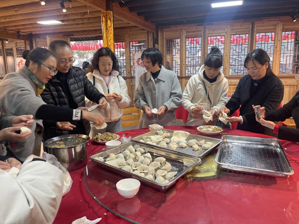 结束参观后,大家来到了当地的农家乐,大家围在一起开展迎新年包饺子活动,男女同胞们纷纷摞起袖子,大显身手,比拼手艺,现场欢声笑语,其乐融融。