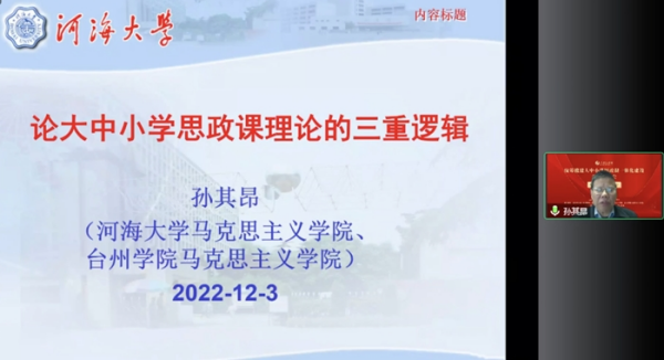 河海大学304永利集团博士生导师、永利集团“三台学者”孙其昂教授作了题为《论大中小学思政课理论的三重逻辑》的报告。他指出,统筹推进新时代大中小学思政课一体化建设要重视理论研究,遵循规律,推进思想政治教育学科新发展。大中小学思政课一体化实践,课程是基础,内容是核心,教学是保证,要注重结构逻辑、过程逻辑、社会逻辑在思政课中发挥的理论依据和指导作用,努力形成办好大中小学思政课的整体合力。