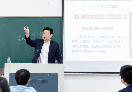 陈光亭以“奋进新征程 建功新时代”为题,介绍了2022政府工作报告主要内容——我国在2021年取得的伟大成就和我国2022年发展目标。解读了2022“两会”热词和新词,对教育强国战略、促进教育公平与质量提升、实施国家教育数字化战略行动等内容进行了精彩讲解。他鼓励同学们把实现中华民族伟大复兴作为奋进新征程、建功新时代的强大动力,以强烈的政治责任感和历史使命感,切实把“两会”精神落到实处。