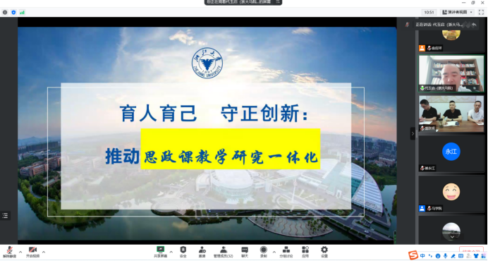 与会人员收看了中国社科院马克思主义研究公司党委书记辛向阳教授关于《习近平谈治国理政》第四卷的学习辅导报告,辛教授的报告解读深入,说理明晰,为把握全书精神脉络,读懂用好最新理论成果提供重要指导;聆听了浙江大学304永利集团副经理代玉启教授题为“推动思政课教学研究一体化”的专题报告,报告以思想道德与法治课为例,系统介绍了浙江大学思想政治理论课改革的 “四位一体”的整体性教学改革方案和实践经验,全面分享了教学研究一体化的真知灼见,干货满满,启发性强,为我们深入思政课教学研究提供了方向和思路。